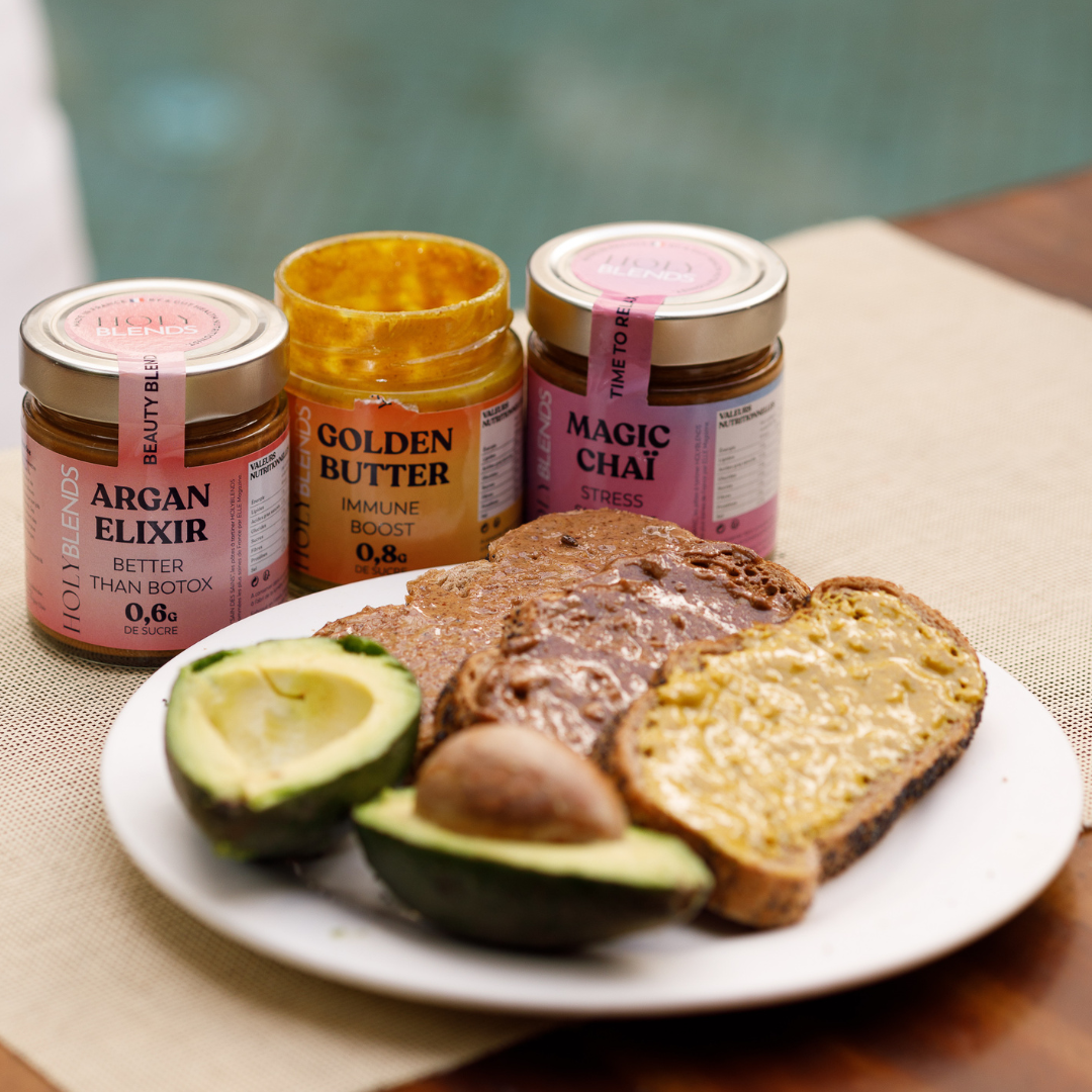 Les 3 pâtes à tartiner Holyblends : Golden Butter, Magic Chai, Argan Elixir